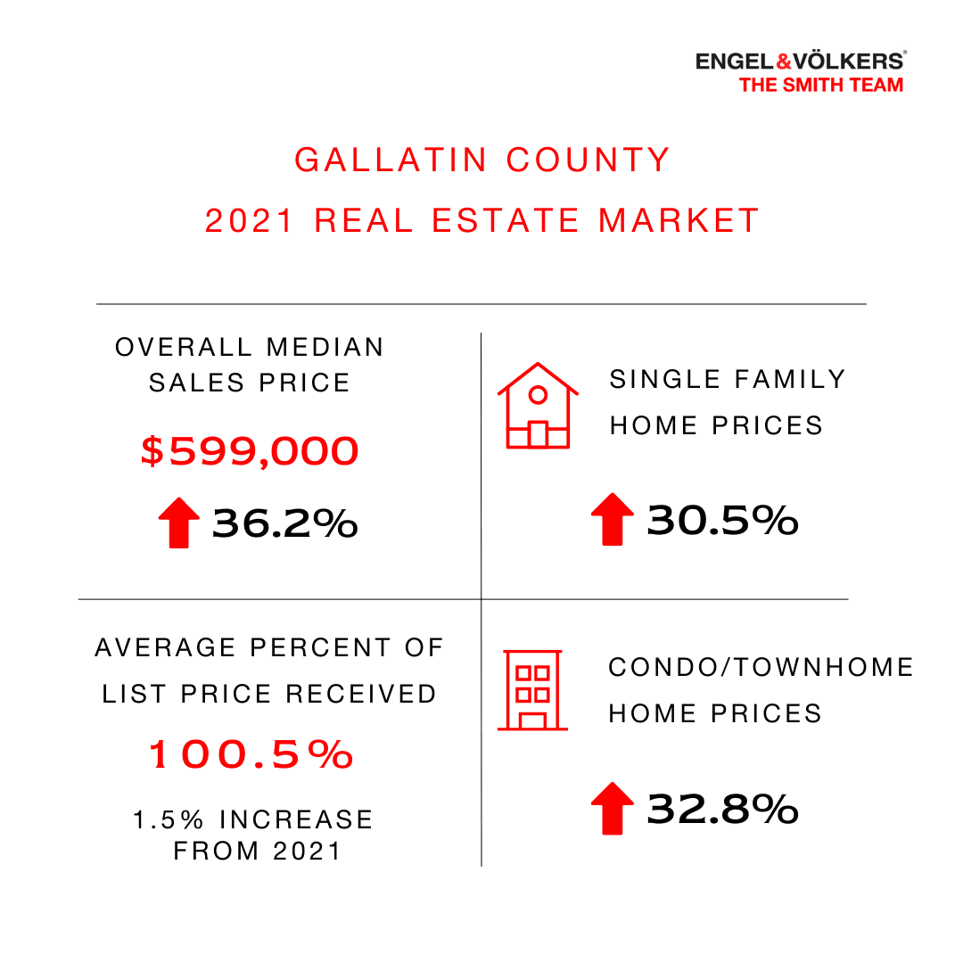 Looking back at 2021, it comes as no surprise that fervent buyer demand dictated another fast-paced year for the real estate market. Every niche area of the market here in Southwest Montana was influenced by the basic economic principals of supply and demand. The lack of housing supply in all areas of the market is driving substantial price increases. Although new construction activity is strong, it is limited by a combination of labor and material shortages and rising material costs. Let’s begin our 2021 Year-End Real Estate Market Review for Bozeman by looking at the greater Gallatin County.